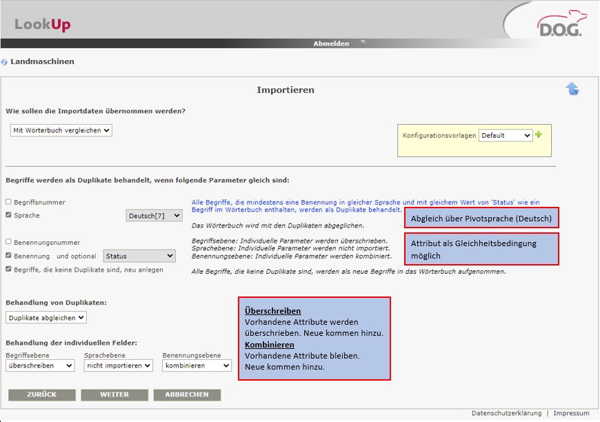 Dies sind nur einige Einsatzbeispiele. Um der Vielzahl der Situationen aus der Alltagspraxis gerecht zu werden, bietet LookUp eine sehr weit entwickelte Konfiguration des Abgleichs und feingliedrige Importentscheidungen getrennt nach Begriffs-, Sprach- und Benennungsebene.