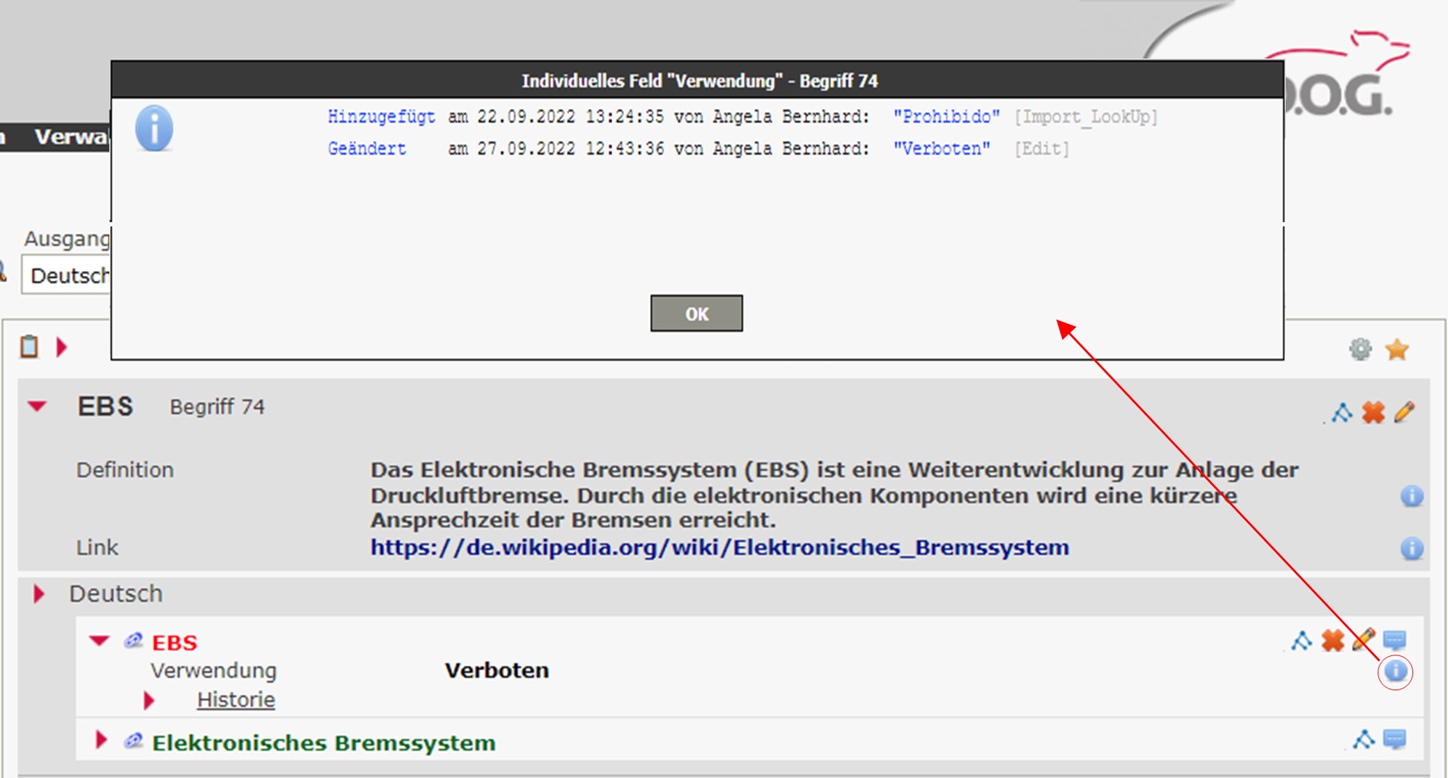 Um Informationen zu einer Feldänderung anzuzeigen, klicken Sie auf das Informationssymbol. Diese Option muss jedoch vorher bei der Konfiguration des Wörterbuchs aktiviert worden sein, siehe Abschnitt Wörterbuch erstellen.