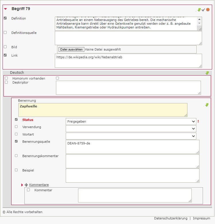 Tragen Sie auf die Begriffsebene die erforderlichen Informationen ein wie z. B. eine Definition, den Link für die Quelle der Definition usw.