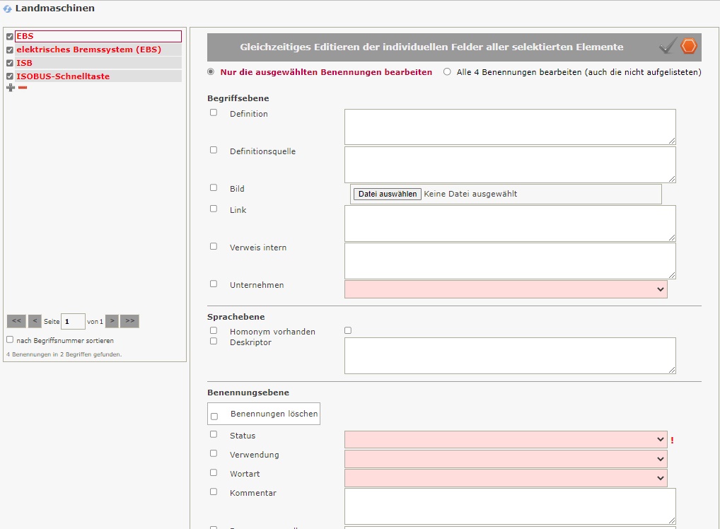 Wenn Sie Alle “n” Benennungen bearbeiten (auch die nicht aufgelisteten) auswählen, werden unabhängig von einer Auswahl über die Kontrollkästchen alle Benennungen des Filterergebnisses geändert. Die Benennungsliste kann sehr umfangreich sein und passt nicht auf einer Seite. Die Entscheidung “Alle” gilt dann auch für die selektierten aber im aktuellen Fenster nicht sichtbaren Benennungen.