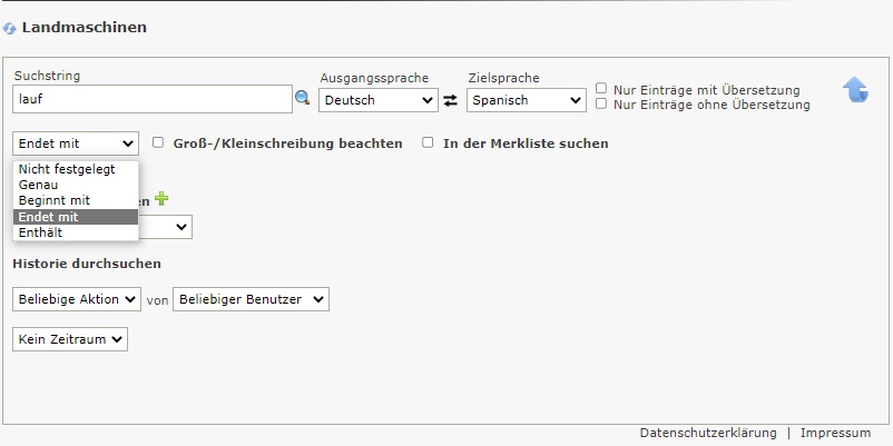Wählen Sie die Sprachrichtung für die Detailsuche aus und geben Sie eine Suchzeichenfolge ein. Sie können nun die Detailsuche durch verschiedene Optionen einschränken. In der linken Dropdownliste können Sie angeben, wie genau die Suchzeichenfolge eingehalten werden muss. Es stehen folgende Optionen zur Verfügung: