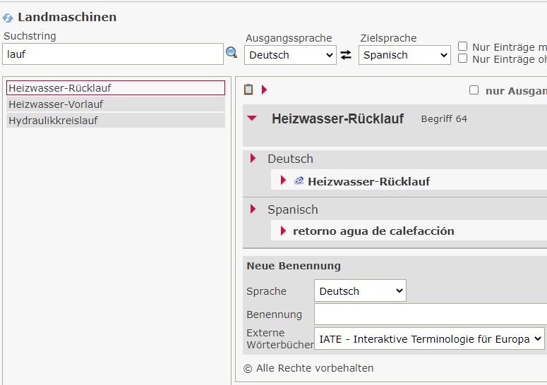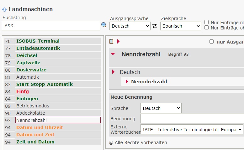 ⇒ In der Benennungsliste auf der linken Bildschirmseite werden alle Einträge angezeigt, die zu der Suchzeichenfolge und der ersten Sprache gefunden wurden.