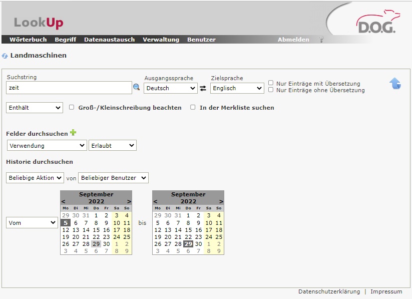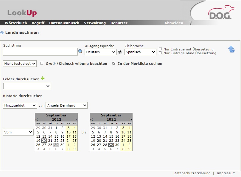 Suchen Sie Im Abschnitt Historie durchsuchen nach Einträgen, die in einem bestimmten Zeitraum bearbeitet wurden. Den Zeitraum legen Sie über die angezeigten Kalender fest.