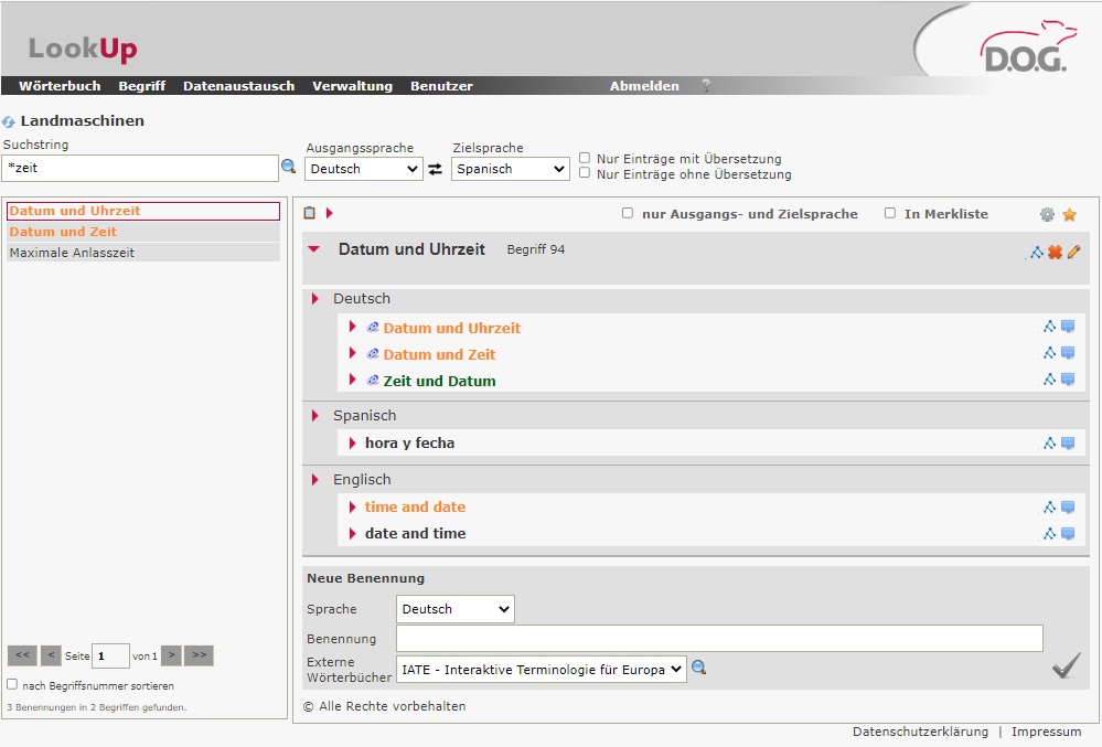 Geben Sie in das leere Feld in der Bearbeitungsleiste unterhalb der Bezeichnung des geöffneten Wörterbuchs eine Suchzeichenfolge ein. Klicken Sie auf das Lupen-Symbol. In der Benennungsliste auf der linken Bildschirmseite werden alle Einträge, die zu der Suchzeichenfolge gefunden wurden, angezeigt.