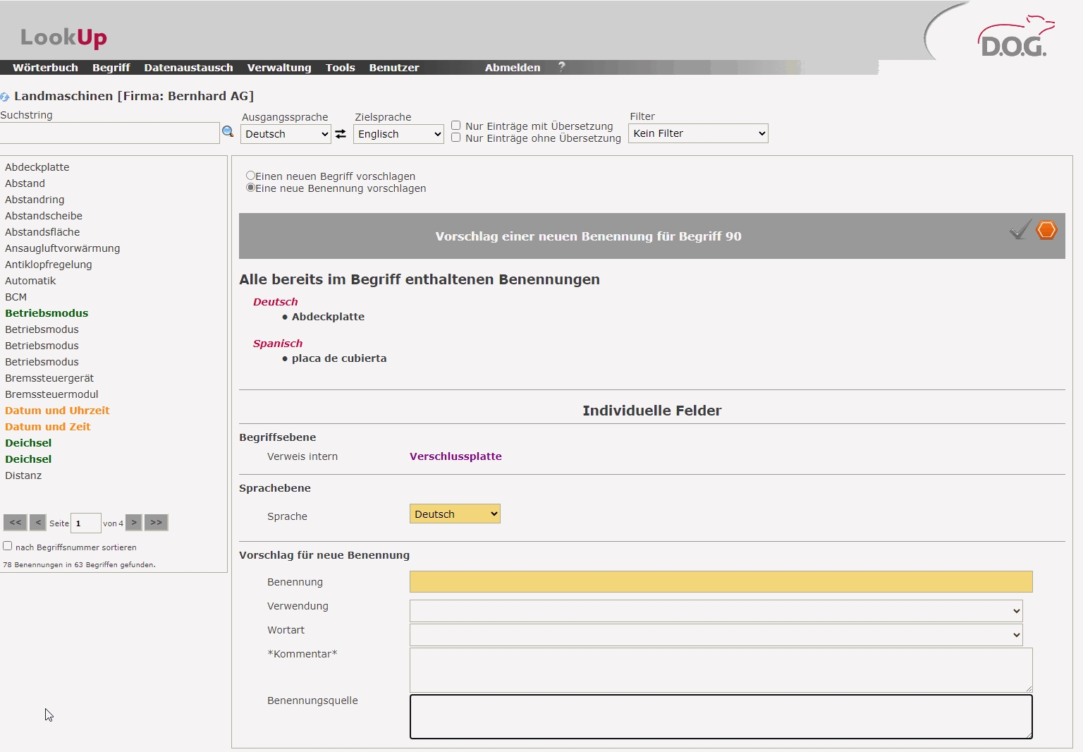 Wenn Sie sich für eine neue Benennung entschieden haben, tragen Sie in die entsprechenden Felder Ihren Vorschlag ein. Der Vorschlag ist für die anderen Benutzer nicht sichtbar.