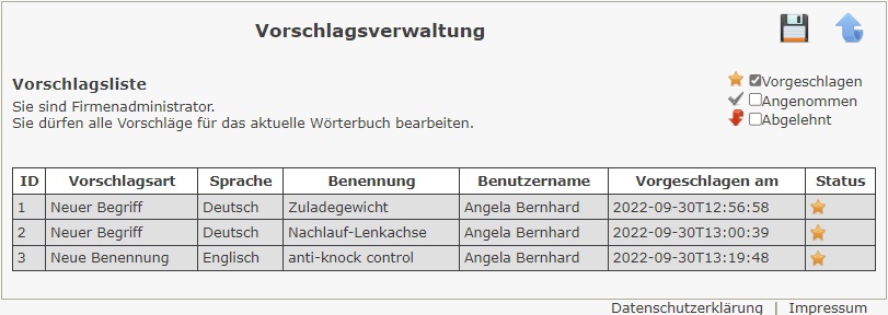 ⇒ Eine Liste der gespeicherten Vorschläge wird angezeigt. Sie enthält neben einer Nummerierung die Vorschlagsart, die Sprache, die Vorschlagsbenennung, den Autor des Vorschlags, das Erstellungsdatum sowie eine Statusangabe mit den möglichen Zuständen Vorgeschlagen, Angenommen und Abgelehnt.