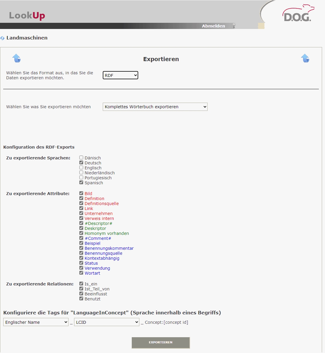 LookUp kann den Inhalt als RDF-Datei exportieren. Der RDF-Export von LookUp ist ein innovatives Merkmal, das viele Terminologieverwaltungssysteme nicht bieten. Es ermöglicht die Nutzung umfangreicher Terminologiedaten für Wissens- und Expertensysteme, wodurch unternehmensweite Wissensprojekte beschleunigt und kosteneffizient gestaltet werden können.