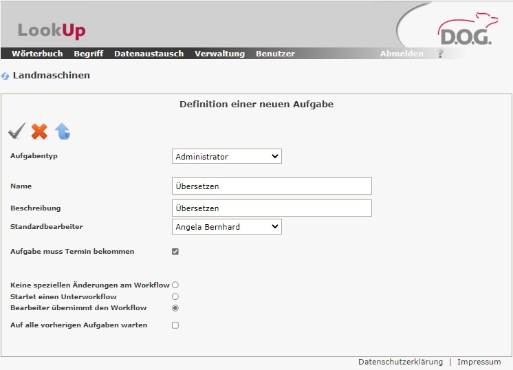 Mit dieser Art von Aufgaben können Sie autorisierten Benutzern mit Workflowverwaltungsrechten Pakete zuweisen, die sie selbst als Unterworkflow organisieren können. Typischer Anwendungsfall: Aufgabe “Übersetzen in 20 Sprachen” geht an externen Dienstleister. Der Projektmanager beim Dienstleister kümmert sich dann darum, dass die ausgewählten Begriffe in die jeweiligen Sprachen übersetzt werden.