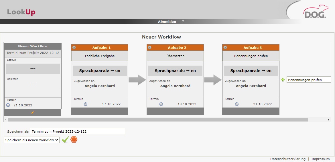 Wenn Sie einen vorhandenen Workflow mit neuen Daten (wie Termin oder Bearbeiter) speichern möchten, klicken Sie auf die Option Speichern als neuen Workflow.