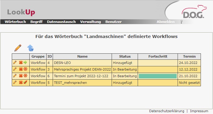Der Terminologiemanager hat eine Übersicht seiner aktiven Workflows: