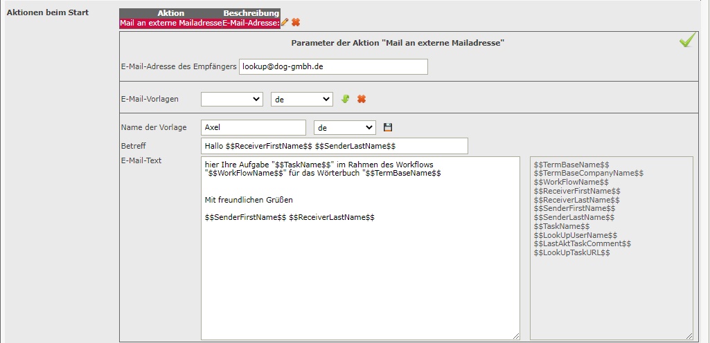 Die Standardwerte aus der Vorlage erscheinen im E-Mail-Fenster. Felder werden aus dem konkreten Workflow automatisch übernommen und werden mit dem doppelten $ eingeleitet. Sie stehen in Anführungszeichen.