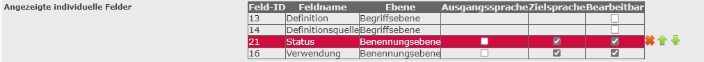 Um bereits hinzugefügte Felder zu löschen oder um die Reihenfolge der Felder zu ändern, klicken Sie auf die betreffende Zeile in der Feldertabelle und auf das gewünschte Symbol.