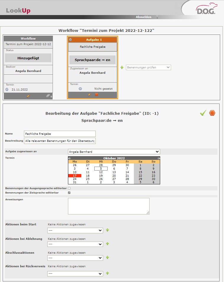 Solange der Workflow nicht gestartet ist, können Sie Daten, Sprachkombination, Termin oder zuständige Mitarbeiter editieren.