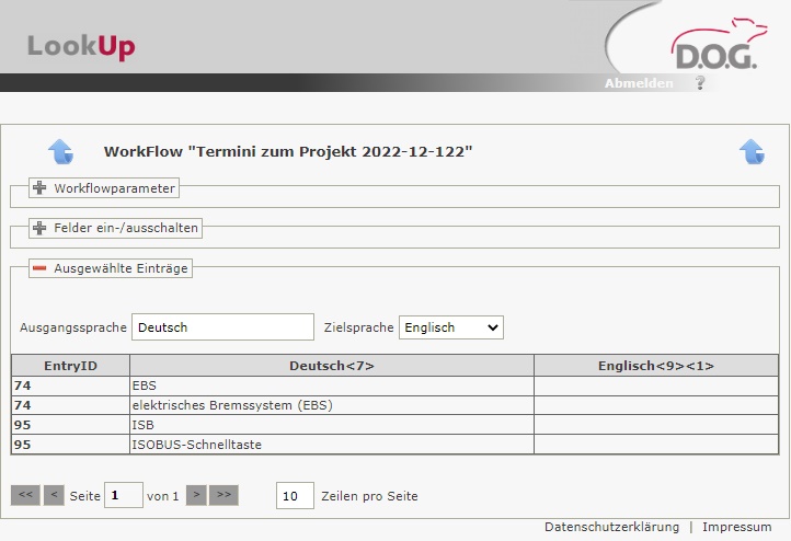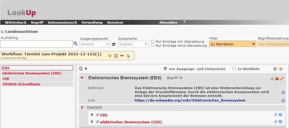 Wenn Sie keine Auswahl treffen und nur auf das grüne Plus-Zeichen klicken, werden alle Benennungen der ausgewählten Sprachkombination in die zu bearbeitende Liste aufgenommen. Dieser Vorgang kann einige Minuten dauern, wenn Ihr Wörterbuch sehr umfangreich ist.