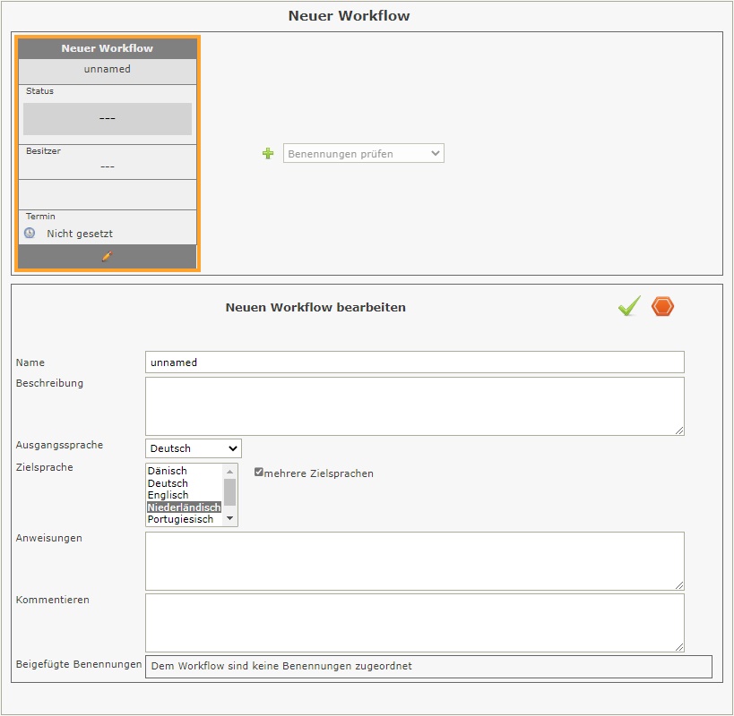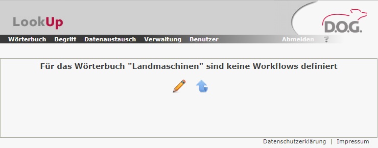 Wenn Sie noch keine Workflows für das Wörterbuch definiert haben, ist diese Liste leer. Ansonsten können Sie hier vorhandene Workflows verwalten bzw. starten. Um einen neuen Workflow zu definieren, gehen Sie wie folgt vor: