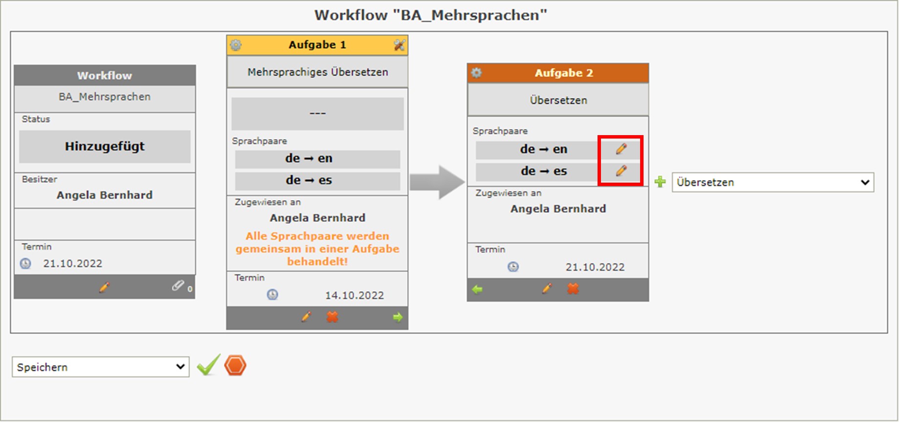 Bei mehrsprachigen Workflows können Sie bei jeder Aufgabe alle Sprachen auf einmal behandeln und behalten trotzdem die Möglichkeit, eine abweichende Konfiguration für einzelne Sprachkombinationen vorzunehmen, indem Sie auf das Bleistift-Symbol neben dem Sprachpaar klicken: