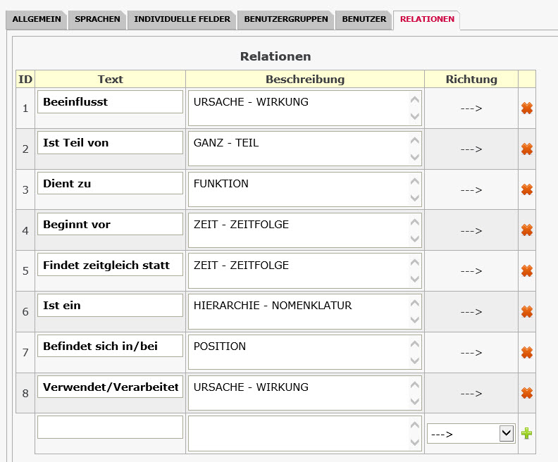 In der Spalte Richtung können Sie aus drei Richtungsmöglichkeiten die Relationsrichtung auswählen. Eine Relationsrichtung geht in der Regel von Begriff 1 nach Begriff 2. Manche Relationen gelten für beide Richtungen. Diese Informationen werden für spätere Auswertungen verwendet.