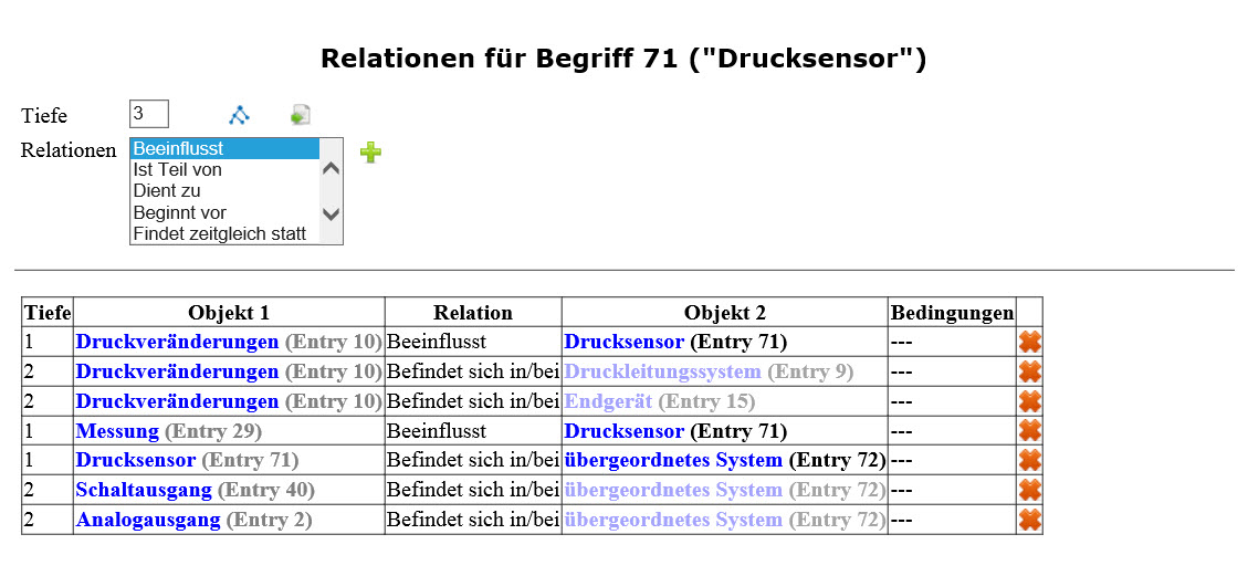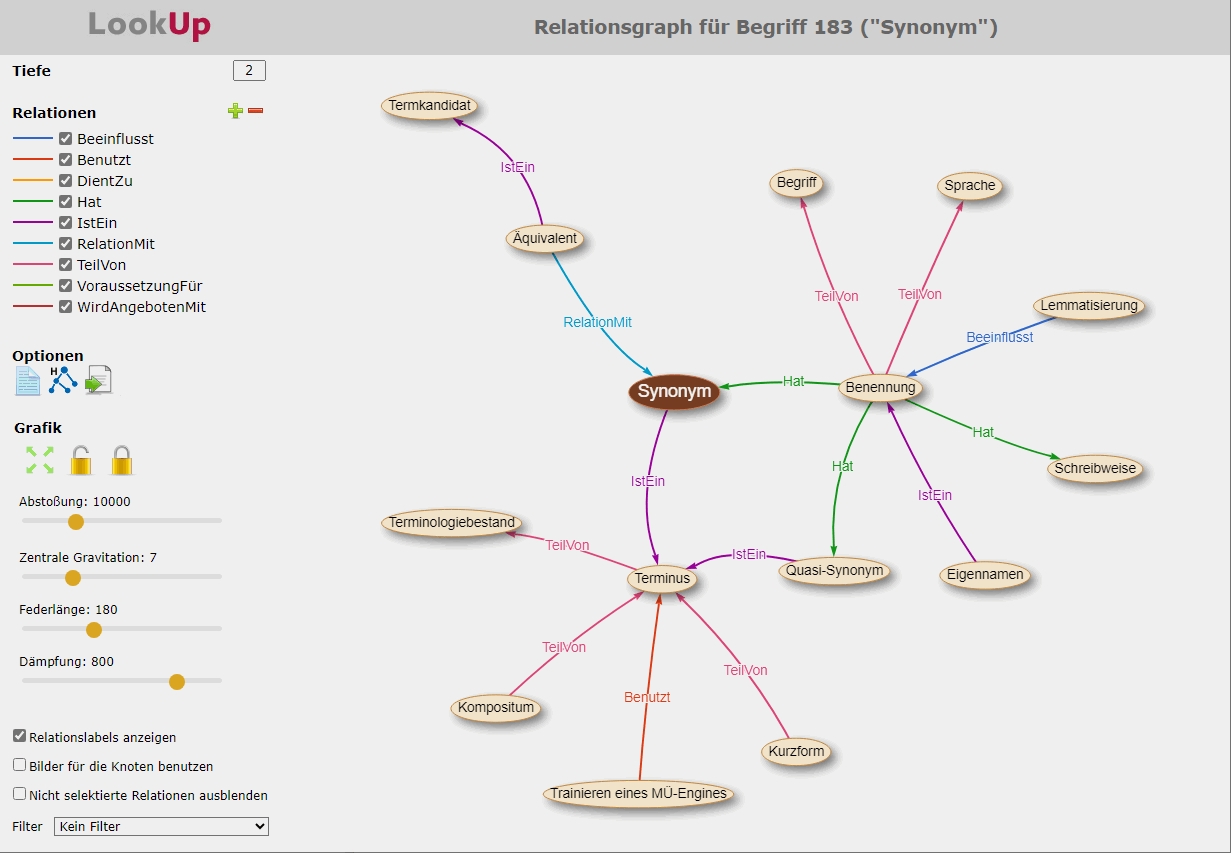 Im Feld Tiefe geben Sie die Anzahl der Ebenen ein, die angezeigt werden sollen. Wenn Sie zum Beispiel die Ziffer 2 eingegeben, sehen Sie die unmittelbaren Relationsbeziehungen, die vom aktuellen Begriff ausgehen und zusätzlich die Relationen, die unmittelbar von den Objekten ausgehen.