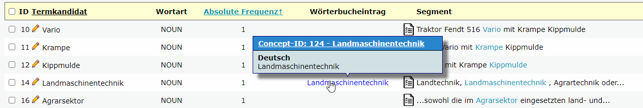 Diese Spalte zeigt an, ob der Termkandidat bereits im Wörterbuch vorhanden ist. Ein Eintrag in dieser Spalte weist auf die Existenz des Begriffs im Wörterbuch hin, was bei der Validierung und Ergänzung der Terminologie hilfreich ist.