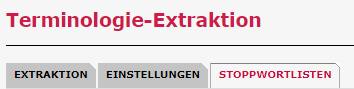 Im Reiter “Stoppwortlisten” können Sie eigene Stoppwortlisten importieren und verwalten. Eine Stoppwortliste enthält Wörter, die von der Extraktion ausgeschlossen werden sollen. Sie können z.B. eine Standardliste verwenden und zusätzlich eine Liste, die Sie für einen spezifischen Anwendungsfall erstellt haben.